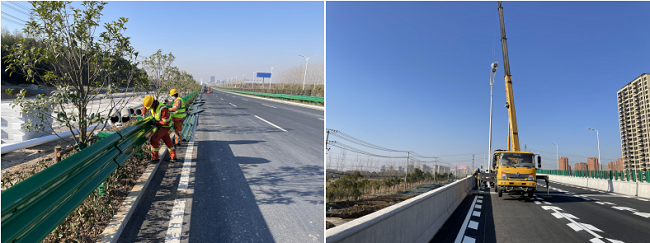 G312快速路項目施工現場,工人們緊張有序調度各項設施設備安裝,加班加點完成道路護欄和路燈的安裝工作,精確完成路面每一節標線的劃定。寒冬低溫下,工人們始終堅守在一線默默付出,全力沖刺年度生產目標。