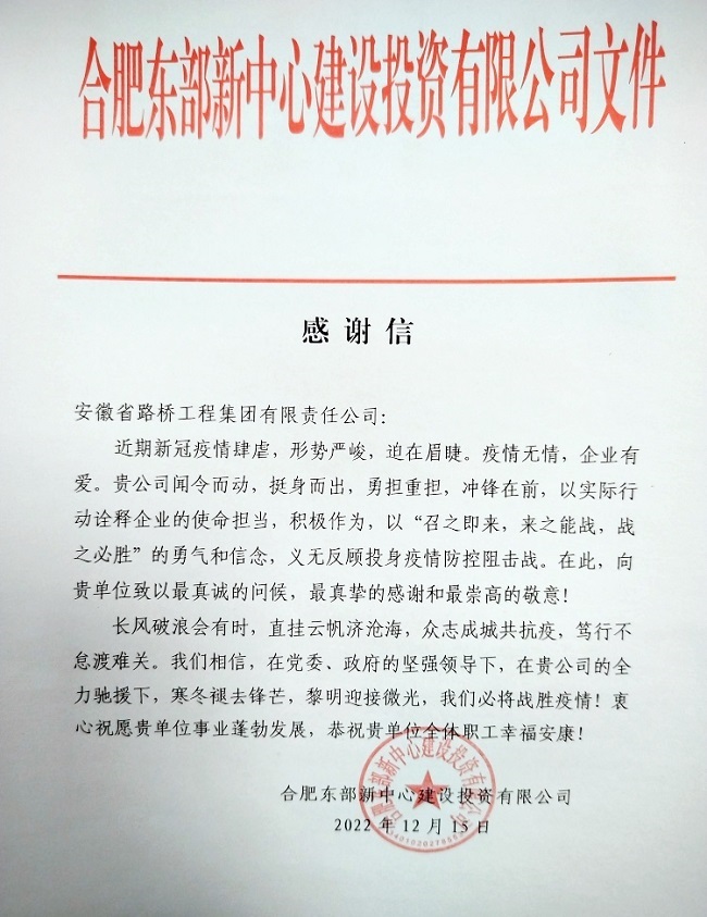 感謝信中指出,疫情無情,企業有愛。安徽路橋集團面對迫在眉睫的疫情形勢,能聞令而動,挺身而出,以“召之即來,來之能戰,戰之必勝”的勇氣和信念,義無反顧投身疫情防控阻擊戰,以實際行動詮釋了省屬國有企業的使命擔當。對此,合肥東部新中心建設投資有限公司向安徽路橋集團致以最真誠的問候,最真摯的感謝和最崇高的敬意。
