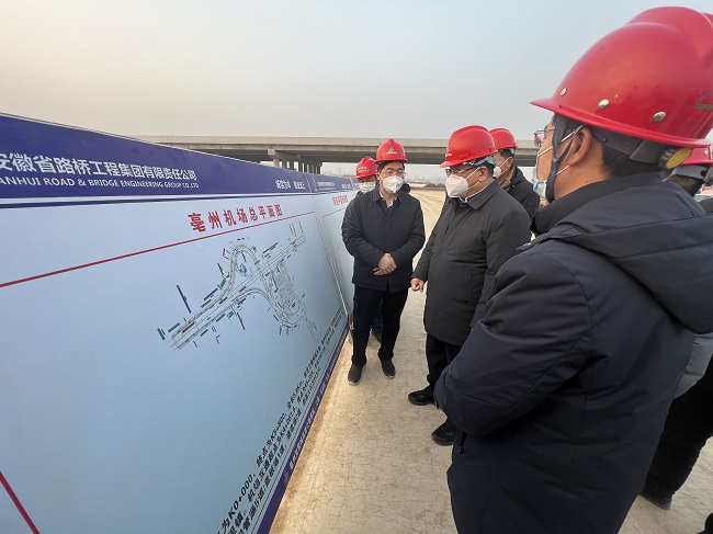 1月9日下午,亳州市委書記杜延安一行赴亳蒙高速01標項目調研指導,市發(fā)展改革委、市自然資源和規(guī)劃局、市住房城鄉(xiāng)建設局、市交通運輸局和市城市管理局主要領導等參加調研。