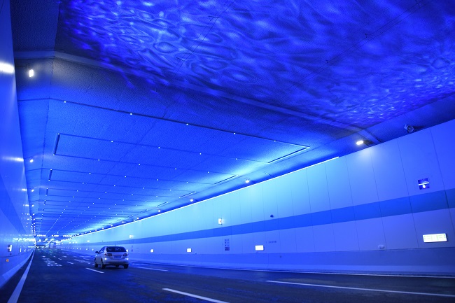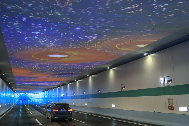 由安徽路橋集團承建的花園大道(徽州大道-包河大道)工程,于2020年12月正式開建。為最大限度減少對駱崗生態公園景觀的影響,花園大道項目主要采取下穿方式,在設計復雜程度、工藝難度系數上均刷新全省“紀錄”,創下全省市政道路建設史上的“多個首個”。其中花園大道與廬州大道在地下交互,是安徽省首個也是最深的地下互通立交工程,最深處距離地面達26米,花園大道位于地下二層,通過地下互通匝道同廬州大道實現交互。隧道設計了三種不同的燈光模式,距東、西側隧道出入口分別約30m、100m處,采用投影燈模式,呈現一片流動的“藍天白云”和“藍色水流”。隧道頂部約有2000米采用節能LED燈,呈現七色繁星變幻模式,點點燈光像夜空的星星明亮閃爍。此外,隧道中央約有100多米的距離,采用了投影機模式,可根據需要變換不同的內容循環播放。為響應節能減排要求,投影模式不會24小時全天候開啟,而將間斷投放。
