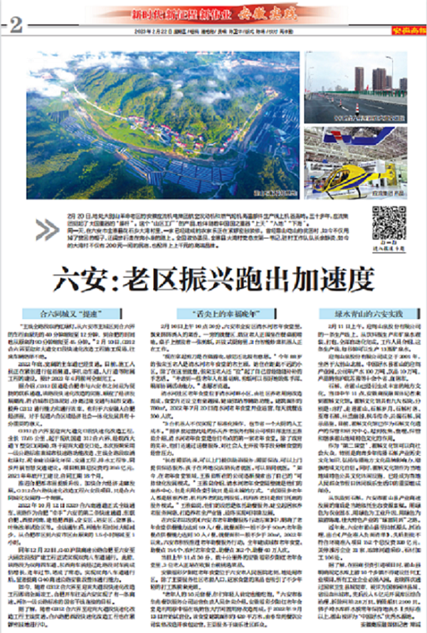 2月22日,在《安徽商報》專版“新時代新征程新偉業——安徽實踐”主題專版稿件《六安:老區振興跑出加速度》中,在“合六同城又提速”模塊,特別報道路橋集團G312項目為六安城市發展作出交通貢獻。