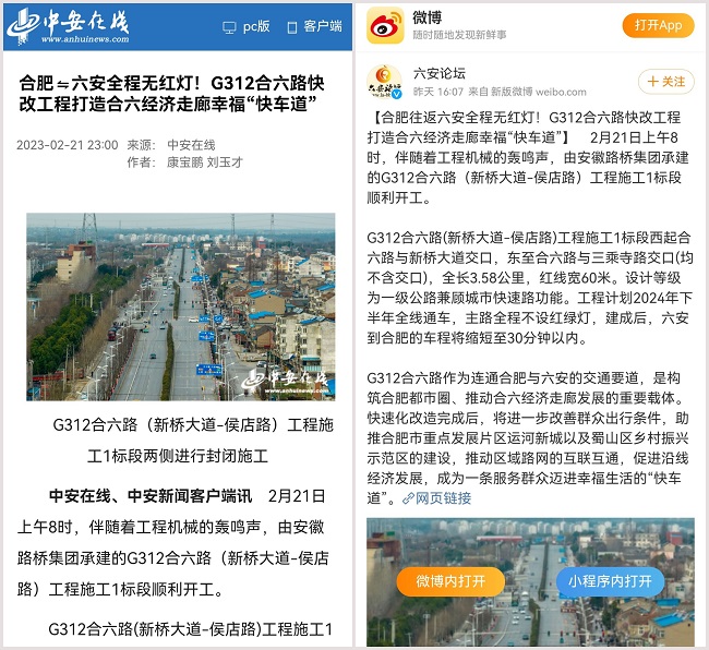 2月22日,中安在線以《合肥往返六安全程無紅燈!G312合六路快改工程打造合六經濟走廊幸?!翱燔嚨馈窞轭},報道路橋集團舉行開工儀式,介紹項目工程意義。