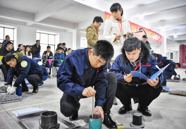 上午八點整,比賽在雄壯的國歌中拉開帷幕,王勝利書記宣布比賽正式開始,本次競賽內容分為材料組粗集料壓碎值試驗、結構組鋼筋保護層厚度檢測、道路組路面抗滑檢測,共6個代表隊參加了比賽。每輪比賽由操作員、協作員共同完成。比賽開始,參賽選手們爭分奪秒,在規定的時間內用自己精湛的專業技術進行試驗操作并記錄,比賽中裁判員現場進行了評判打分,最后由裁判組根據現場實操、記錄報告情況進行綜合評判。