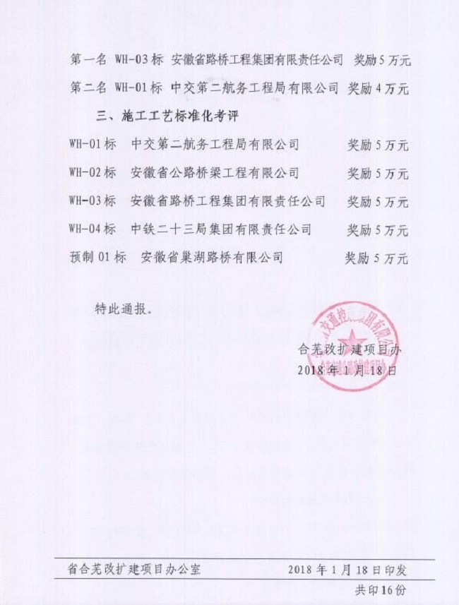 1月18日,合蕪改擴建項目辦傳來喜訊:項目辦2018年1月9號-10號開展的第四季度綜合考評工作中蕪合高速改擴建03標項目部取得了第一名的好成績。