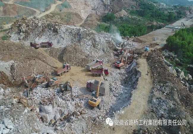 天石鈣業(yè)地處新杭服務(wù)區(qū)上行段,樁號(hào)K8+600-K8+800。這短短的200米范圍內(nèi)遍布著硬質(zhì)石山、低壓桿線、采石礦場、居民住房等,推進(jìn)難度十分巨大,為了加快進(jìn)度,項(xiàng)目部決定采用雙向推進(jìn)的方法,由大小樁號(hào)同時(shí)向中間開挖,投入大量機(jī)械,提高施工效率。由于該段內(nèi)多硬質(zhì)石山,必須采用爆破開采,受限于政府的炸藥管制政策,工作開展較慢。為此,項(xiàng)目部積極與政府有關(guān)部門溝通協(xié)調(diào),最終獲得了炸藥使用權(quán),并采用超深孔爆破的方法大大提升了開采速度。針對(duì)斷點(diǎn)內(nèi)的桿線、房屋問題,項(xiàng)目部積極協(xié)調(diào),配合政府部門拆除紅線內(nèi)房屋,并在獲得相關(guān)部門批準(zhǔn)后,自行組織人員機(jī)械對(duì)桿線進(jìn)行遷移,掃清了工作推進(jìn)中的拆遷問題。