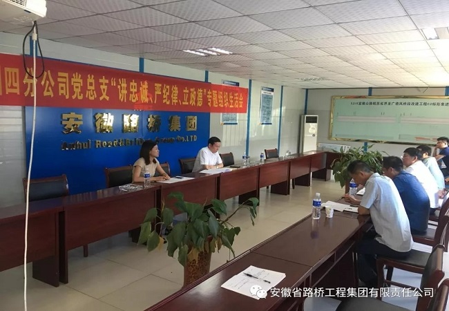 7月18日下午,四分公司黨總支在廣德S215-02標項目會議室召開“講忠誠、嚴紀律、立政德”專題織生活會。會議由黨總支書記朱大俊主持,四分公司黨總支全體委員參加。公司黨委書記、董事長、總經理盛明宏,黨委工作與人力資源部副主任徐慧玲到會指導。