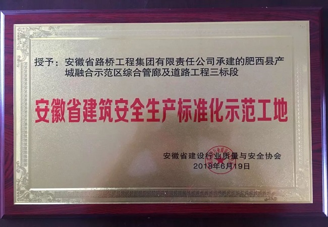 6月19日,安徽省建設行業質量與安全協會下發了2018年度第一批安徽省建筑安全生產標準化示范工地(小區)名單,并于近日完成了授牌。公司承建的肥西縣產城融合示范區綜合管廊及道路工程三標段項目榮獲“省級安全生產標準化示范工地”稱號。