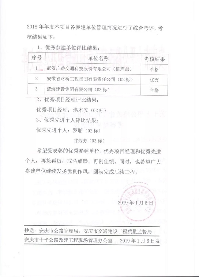 1月6日,我公司承建的安慶市十平公路改建工程項目在業主開展的2018年度綜合考核中取得優異成績。項目部被授予“優秀項目部”稱號,洪本安同志被授予“優秀項目經理”稱號,羅聃同志被授予“優秀先進個人”稱號。