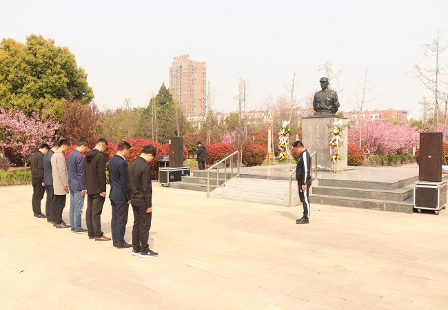 上午9點36分,全體人員在莊嚴肅穆的泗縣烈士陵園彭雪楓廣場上,面向“二十年艱難事業(yè),即將徹底完成,忍看功績輝煌,英名永在,一世忠貞,是共產(chǎn)黨人好榜樣”的彭雪楓將軍烈士塑像默哀三分鐘并敬獻花籃,表達了對革命先烈無限的崇敬和深切地緬懷。隨后,全體黨員面向黨旗重溫入黨誓詞!