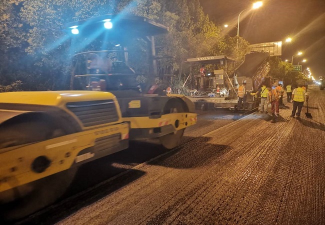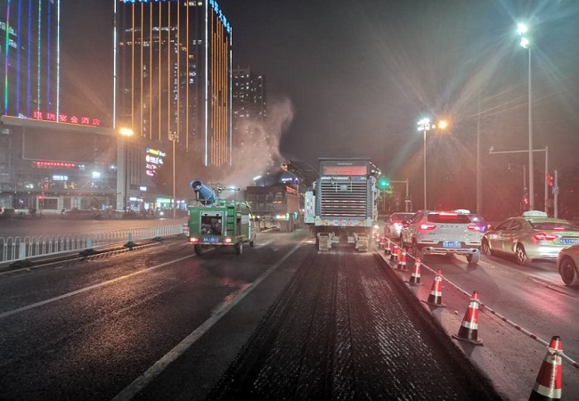 為保證施工安全,項目部明確施工任務、時間節點和現場責任人,做好交通導流和安全防護工作。施工現場,銑刨機開始銑刨,渣土車馬不停蹄運輸銑刨料,水穩攤鋪有條不紊進行,振動壓路機反復碾壓以達到壓實密度。最后,瀝青攤鋪機將修復路面所需瀝青回填入坑凼內,振動壓路機對回填路面進行碾壓夯實,使路面成型并保持與原路面水平狀態,待瀝青完全冷卻后車輛便可正常通行。在設備與人員的合理搭配下,項目部以最快速度實現快銑快修快鋪,用實際行動推進工程建設,掀起項目大干熱潮。