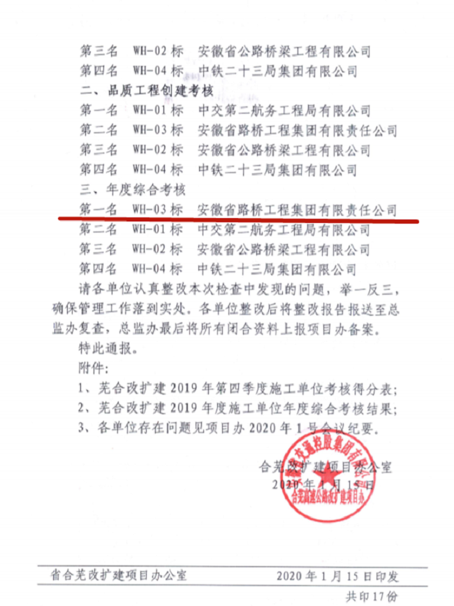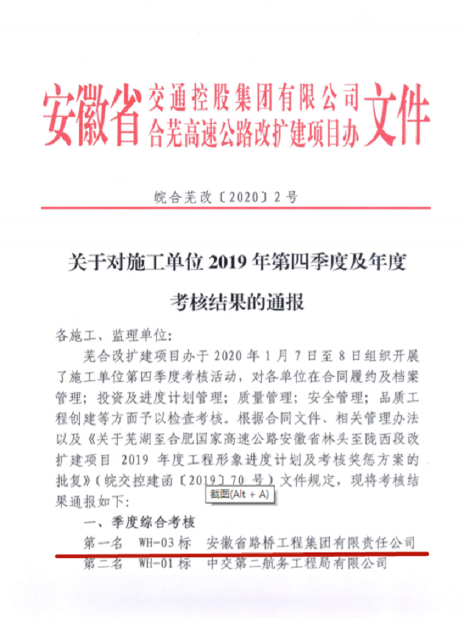 2020年1月16日,蕪合改擴(kuò)建項(xiàng)目辦傳來喜訊,安徽路橋集團(tuán)蕪合高速改擴(kuò)建三標(biāo)項(xiàng)目在項(xiàng)目辦組織開展的施工單位第四季度考核活動(dòng)中喜獲年度綜合考核第一、第四季度綜合考核第一。