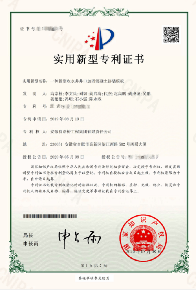 5月8日,利辛PPP項目研發的《一種新型收水井井口加固混凝土拼裝模板》(鋼模板)獲得國家知識產權局頒發的實用新型專利證書,這是利辛PPP項目獲得的第三個實用新型專利證書。