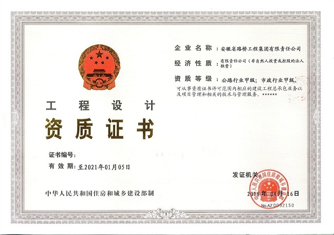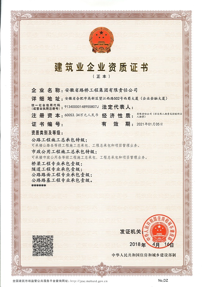 4月16日,住建部公布《關于核準2018年度第三批建設工程企業資質名單》,安徽路橋集團成功晉升公路工程施工總承包特級資質,同時獲得公路行業甲級設計資質。繼市政公用工程施工總承包特級資質及市政行業甲級設計資質申報成功后,安徽路橋集團資質升級工作再獲豐收,成為安徽省內首家擁有市政、公路“雙特雙甲”資質企業,也成為全國為數不多的公路、市政總承包雙特級資質企業!