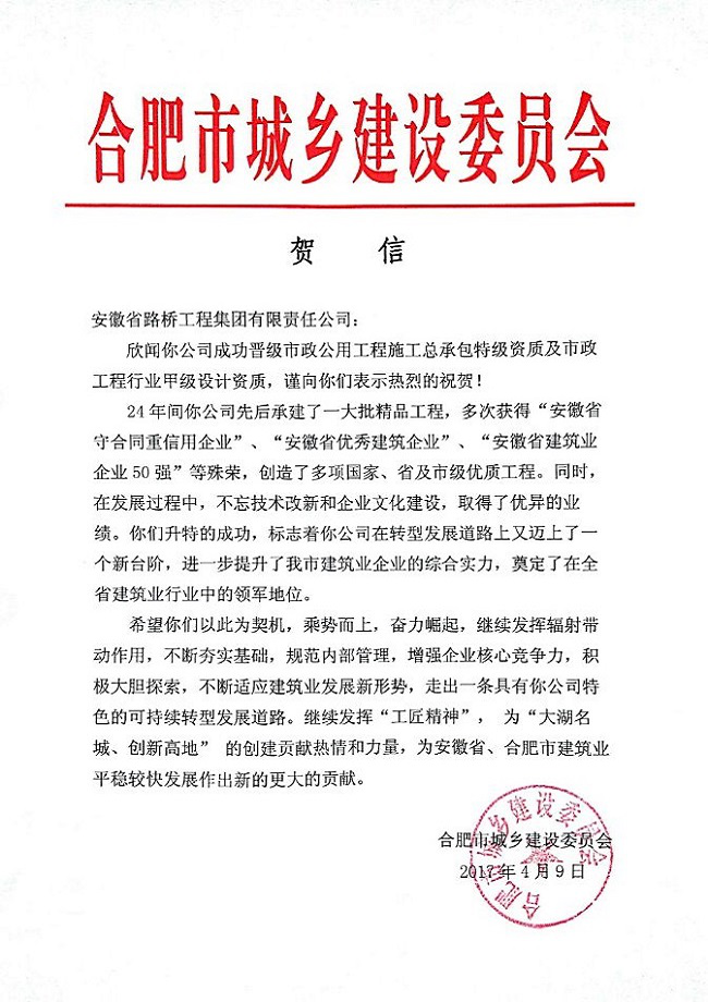 4月1日,經國家住建部核準,安徽省路橋工程集團有限責任公司成功獲得市政公用工程施工總承包特級資質及市政行業甲級設計資質。將公司“十三五”戰略規劃末期計劃實施的宏偉藍圖,提前繪就!