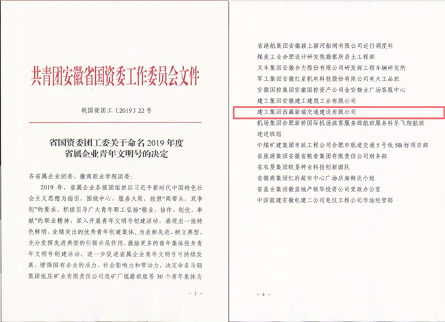 近日,省國(guó)資委團(tuán)工委命名表彰2019年度省屬企業(yè)青年文明號(hào)集體,安徽路橋集團(tuán)西藏新瑞公司獲“2019年度省屬企業(yè)青年文明號(hào)”榮譽(yù)稱號(hào)!
