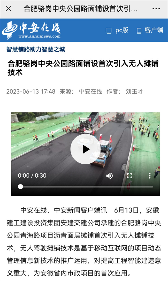 6月13日,建設投資集團安建交建公司青海路項目瀝青面層攤鋪施工順利進行。本次施工引入無人攤鋪技術,為安徽省內市政項目的首次應用。