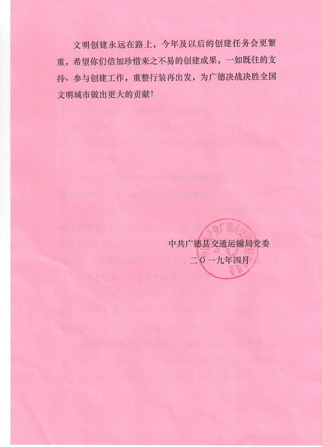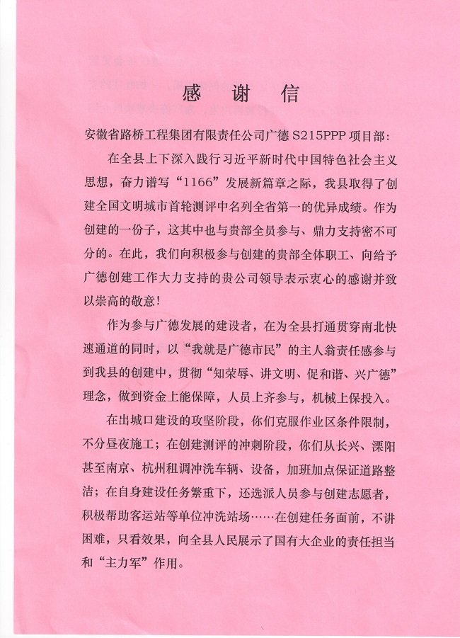近日,公司收到廣德縣交通運(yùn)輸局發(fā)來(lái)的感謝信。信中對(duì)安徽路橋集團(tuán)廣德S15PPP項(xiàng)目部保質(zhì)保量完成項(xiàng)目建設(shè)目標(biāo)給予充分認(rèn)可和高度贊譽(yù),并對(duì)公司為廣德縣發(fā)展作出的努力和貢獻(xiàn)表示衷心感謝。