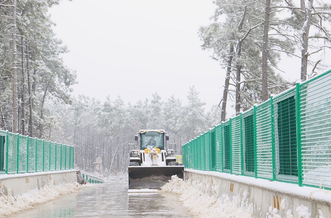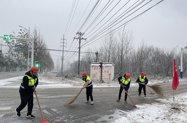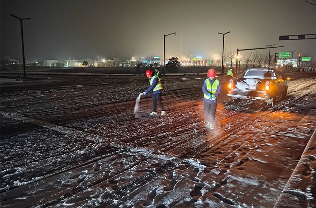面對寒潮降雪天氣,項(xiàng)目部“以雪為令”,迅速啟動惡劣天氣應(yīng)急預(yù)案,全面開展除積雪工作,全力為群眾出行安全、道路暢通保駕護(hù)航。通過科學(xué)分工,明確任務(wù),管理人員對施工現(xiàn)場、生活區(qū)、辦公區(qū)等進(jìn)行了全方位檢查,尤其是對施工區(qū)的鋼筋大棚以及各平交路口等重點(diǎn)部位進(jìn)行了詳細(xì)的安全排查。項(xiàng)目員工在施工道路改三橋(K8天橋、金梅路跨206天橋、K12天橋)進(jìn)行了撒鹽解凍和積雪鏟除等工作,在重點(diǎn)路段加強(qiáng)巡邏管控,引導(dǎo)車輛減速慢行,確保道路總體通暢。