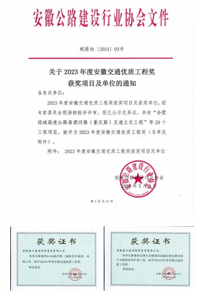 近日,安徽省公路建設行業協會發布通知文件,公布2023年度安徽交通優質工程獎獲獎項目及單位名單,共20個工程項目獲獎。由建工建投集團承建的蕪湖至合肥國家高速公路安徽省林頭至隴西段改擴建工程、G346巢廬路(盛橋至廬城段)改建工程榜上有名。