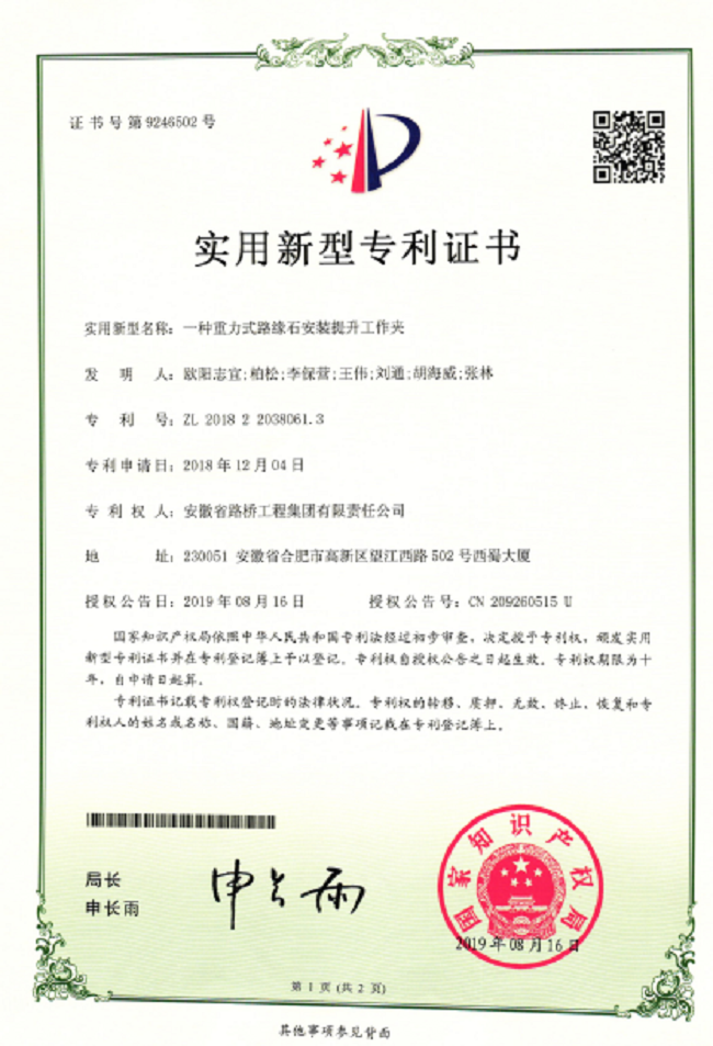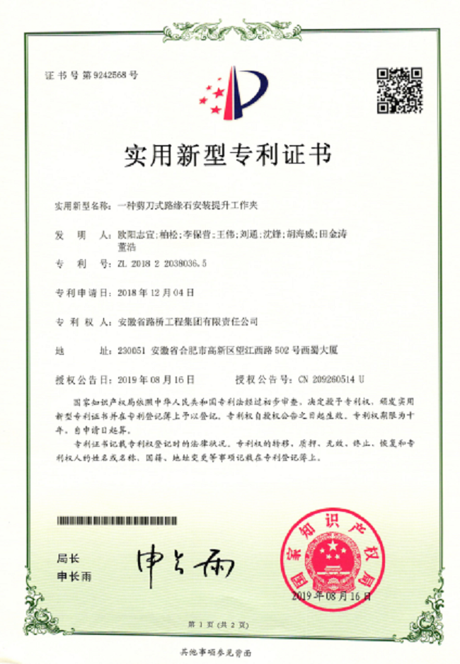 由一分公司高劉農(nóng)村暢通工程項目部申報的《一種重力式路緣石安裝提升工作夾》、《一張剪刀式路緣石安裝提升工作夾》兩項專利近日通過審查,被授予國家知識產(chǎn)權(quán)局實(shí)用新型專利權(quán),專利號為:210822038061.3和201822038036.5。