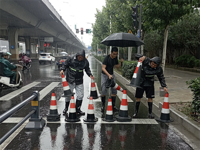 潛山路(望江西路-長江西路)改造工程項目針對汛期合理安排項目人員輪班值守,時刻關注天氣變化,加強防汛準備,在道路積水段采用人工助排、設備抽水等方式,保障社會道路暢通,同時協助交警部門指揮沿線過往車輛,全力以赴確保居民出行安全。