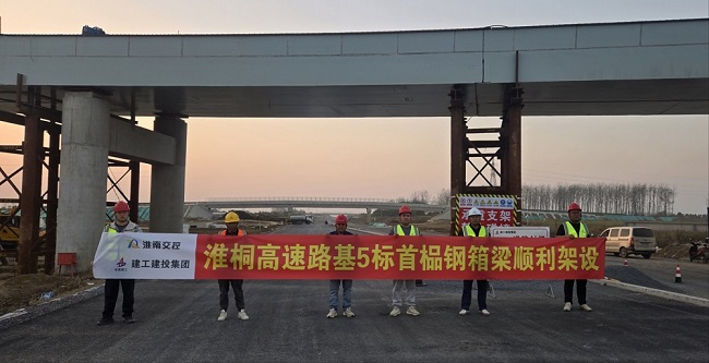 11月3日上午,由建工建投集團承建的淮桐高速05標項目首榀鋼箱梁順利架設完成。