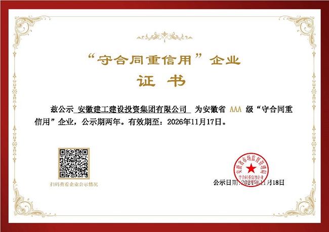 安徽省市場監督管理局此次給予“AAA級”評定,不僅是對建工建投集團合同信用管理、穩健經營業績、良好社會信譽的高度認可,更是對企業一貫秉承誠信經營理念的最好贊譽。