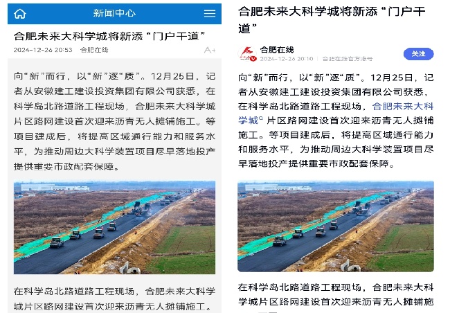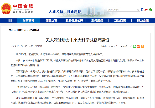 12月25日,建工建投集團(tuán)合肥市科學(xué)島北路等4條道路工程項(xiàng)目瀝青下面層無人攤壓施工順利進(jìn)行。《合肥日報(bào)》、合肥在線等媒體深入項(xiàng)目一線展開報(bào)道,稿件登上合肥市政府官網(wǎng)首頁。
