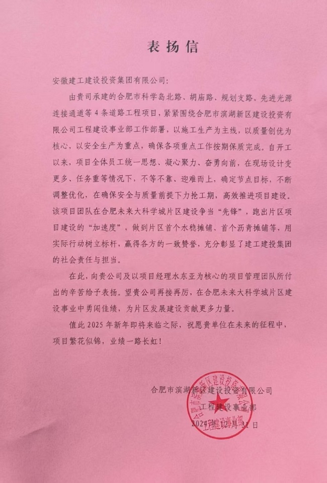 近期,建工建投集團(tuán)喜訊頻傳,合肥市科學(xué)島北路、胡廟路、規(guī)劃支路、先進(jìn)光源連接通道等4條道路工程項(xiàng)目與長豐下塘鎮(zhèn)城市更新余崗路等8條道路建設(shè)工程項(xiàng)目2標(biāo)段先后收到業(yè)主單位合肥市濱湖新區(qū)建設(shè)投資有限公司和長豐縣重點(diǎn)工程管理建設(shè)中心的表揚(yáng)信。