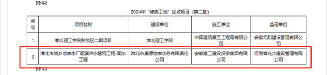 近日,我司承建的淮北市城鄉地表水廠配套供水管網工程-配水工程再次傳來喜訊,項目部在2024年淮北市第二批“四個工地”試點的評選中成功被授予“綠色工地”試點稱號!這是在該項目被成功授予“安心工地”試點稱號后所取得的又一項殊榮,更是對我司在綠色施工、節能環保方面取得成績的高度認可,也是踐行國家“碳達峰、碳中和”戰略目標的具體體現。