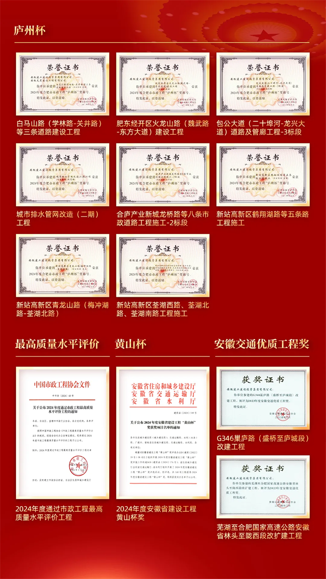 2024年2月,承建的G346巢廬路(盛橋至廬城段)改建工程等2個項目獲得安徽交通優質工程獎;