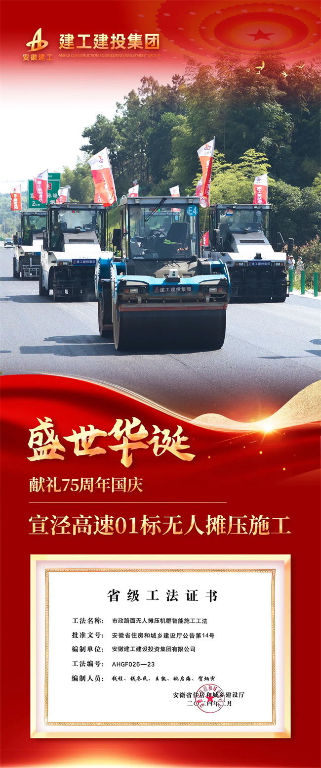 3月,研發總結的《市政路面無人攤壓機群智能施工工法》獲評安徽省優秀省級工法。5月-8月,由建工建投集團主導的無人攤壓機群智能施工技術率先實現在省內高速公路施工大規模應用,并組織全省交通骨干企業開展觀摩交流,受到省行業主管部門關注和各大主流媒體宣傳。