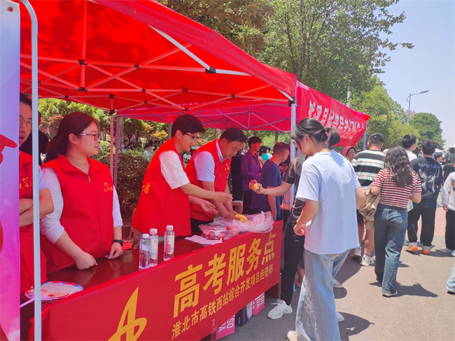 淮北市高鐵西站綜合開發項目在濉溪縣第二中學外搭建起溫馨的服務站,為考生和家長提供各類貼心服務,如礦泉水、防暑物品、水果等。他們以真誠的笑容和細致的關懷,為緊張的高考氛圍增添了溫暖與力量。