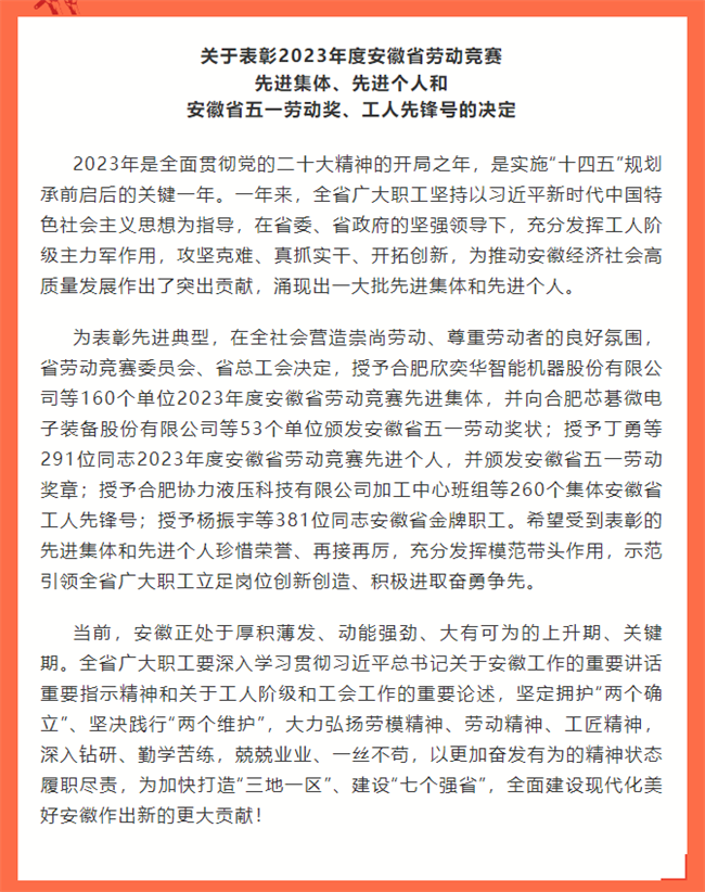 4月28日,安徽省總工會發(fā)布《關(guān)于表彰2023年度安徽省勞動競賽先進集體、先進個人和安徽省五一勞動獎、工人先鋒號的決定》,公司喜獲“安徽省勞動競賽先進集體”榮譽稱號。