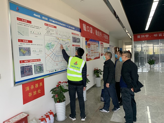 徐文聯一行先后前往月臺路項目、錦繡大道項目施工現場,實地調研疫情防控與復工復產情況。在隨后的調研座談會,徐文聯詳細詢問防疫物資儲備、人員到崗、施工進度、成本管控等內容,并對錦繡大道項目、月臺路項目所做的工作給予了充分的肯定,
