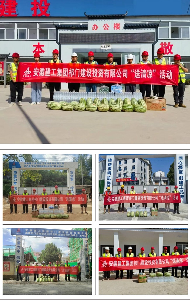 在F012塔坊至平里公路改建工程項目、“安鄉”茶園田園綜合體工程項目、南部片區(平里鎮)旅游業態打造項目、祁門經濟開發區低碳科創園基礎設施項目、電商物流產業園項目、梅城大廈建設工程項目的施工現場祁門建投領導班子為一線工作人員送去綠豆、人丹、十滴水、西瓜、礦泉水等防暑降溫物品,對高溫下堅守一線的員工表示誠摯的慰問和衷心的感謝,叮囑大家要注意休息,提高自我保護意識。同時,要求項目管理團隊要認真落實好防暑降溫各項措施,備足備齊防暑降溫物資,守牢安全生產底線,合理安排工作時間,采取減少高溫時段室外作業、輪換作業、減輕勞動強度等措施,把防暑降溫工作落到實處,確保一線員工的身體健康和施工生產安全有序推進。