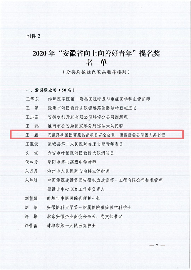 近日,安徽路橋集團西藏昌都項目安全總監(jiān)、西藏新瑞公司團支部書記王穎獲得2020年“安徽省向善向上好青年”提名獎。