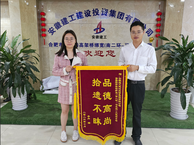 近日,市民李女士將一面印有“拾遺不昧 品德高尚”字樣的錦旗送到建工建投金寨路高架橋綁寬項目部,對項目管理人員拾遺不昧、妥善保管、積極尋人的行為表示真摯的感謝。