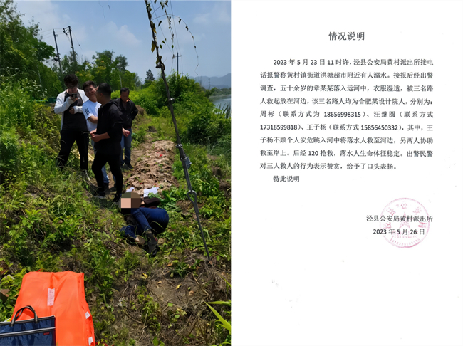 據悉,5月23日上午11時許,王子楊等三人在涇縣黃村鎮街道洪塘超市附近進行測繪作業時,發現一名村民溺水從上游漂下。該河段水面寬約60米,水深3-4米,水流湍急,情況萬分危急。三人不及多想,一邊報警,一邊立即組織救援行動。利用洪塘橋邊取下的救生圈、救生衣等設施,王子楊奮不顧身跳入河中,以最快的速度游到溺水村民身邊,他雙手托舉、雙腳拼命踩水,憑著充沛的體力和頑強的毅力,在汪繼圓、周彬的有力配合下,順利將其拖到岸邊,進行簡單檢查后安全的交給了警察。隨后,聞訊趕來的溺水村民家屬向王子楊等三人表達了深切謝意。由于施救及時,經搶救后的溺水村民目前已脫離生命危險。