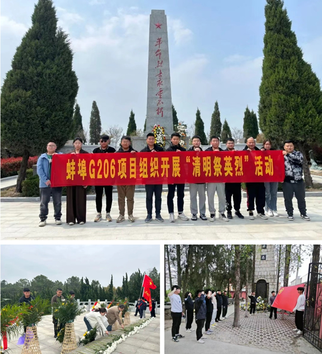 合周高速潁臨段項目、阜淮高速項目、合廬項目、蚌埠G206項目前往屬地烈士陵園向革命烈士默哀致敬、敬獻鮮花,深切緬懷革命先烈的豐功偉績。全體團青還面向團旗重溫入團誓詞,堅定不忘初心跟黨走的信念。最后,團青們繞碑瞻仰,重溫革命歷史,感受革命先烈們的頑強拼搏、視死如歸的精神。