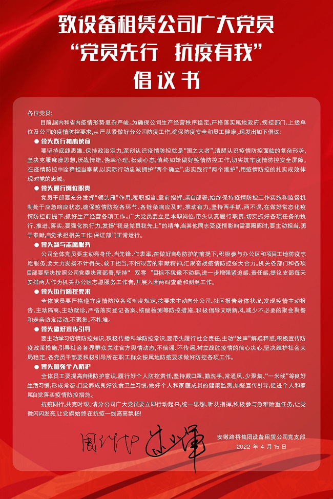 4月18日, 設備租賃公司分公司黨支部發出《“黨員先行 抗疫有我”倡議書》,號召全體員工特別是黨員干部堅決貫徹習近平總書記重要指示精神,按照建工控股黨委和公司黨委部署要求,充分發揮黨員干部的主體作用,為打贏這場疫情防控攻堅戰貢獻自己的智慧和力量。