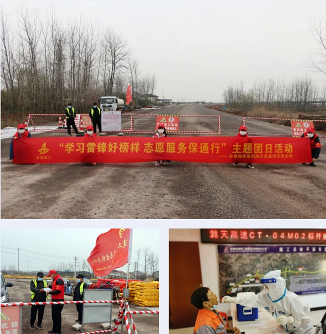 活動期間,滁天高速項目開展“學習雷鋒好榜樣,志愿服務保通行”主題團日活動。滁天高速項目團支部積極動員廣大青年職工錯峰輪崗,主動參與到當地交通管制道口值勤,承擔起“人人都是安全員”的崗位責任,為項目安全生產、周邊居民出行保駕護航。此外,項目部主動聯系來安縣醫院對標段內400多名參建人員進行免費核酸檢測,積極選派項目青年團員參與到G235(滁州市來安縣與南京六合區)疫情防控卡點值班,協助屬地政府做好往來人員核碼、測溫及車輛管控工作,并向現場工作人員送上慰問物資,為打贏疫情防控阻擊戰盡一份責任和義務。