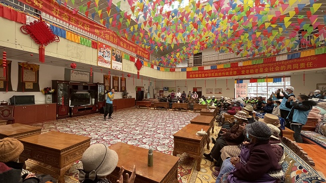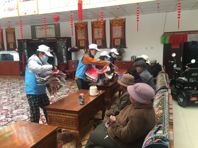 西藏新瑞公司青年志愿者一行來到拉薩市社會福利院,幫助社會福利院開展衛生清理、花壇雜草清除等實踐活動,為孤寡老人送上保溫杯、圍巾、棉被、帽子等愛心物資,還為他們包水餃、演節目,陪老人們一起度過了一個溫馨的節日。