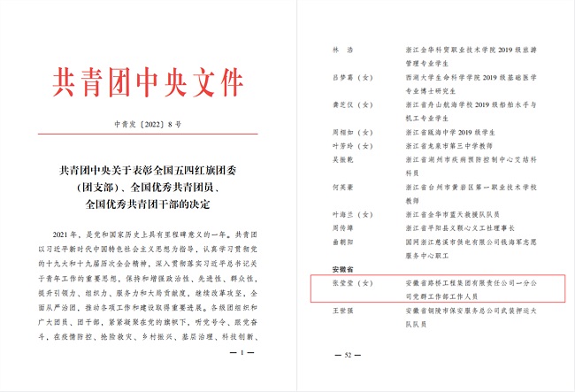 2022年是中國共青團成立100周年。近日,共青團中央作出表彰決定,安徽路橋集團一分公司黨群工作部張瑩瑩榮獲“全國優秀共青團員”稱號,該稱號是共青團中央授予團員青年的最高榮譽!