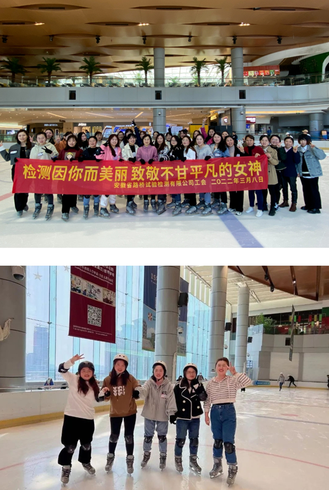 檢測公司組織母體全體女職工在合肥萬象城開展“檢測因你而美麗,致敬不甘平凡的女神”滑冰主題活動。女職工們從一開始的手扶圍欄、蹣跚滑稽的冰上行走,逐漸提高到進階技巧的緩緩滑行,大家在教練悉心的講解示范中逐步體會到滑冰的動作要領,感受冰上運動帶來的歡樂。