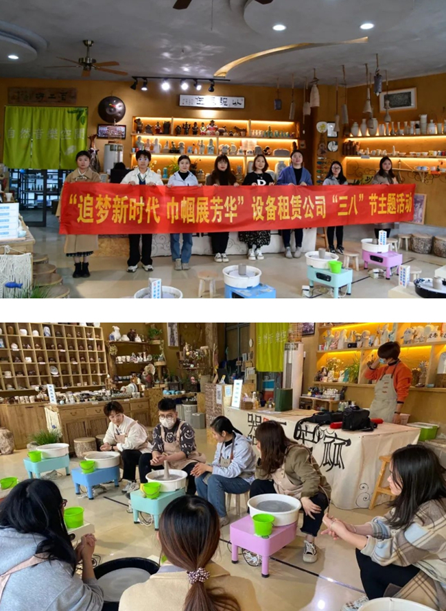 設備租賃公司組織女職工開展“追夢新時代,巾幗綻芳華”陶藝體驗創作活動。陶藝老師帶著女職工們參觀了工作室中的陶藝工藝品,介紹陶藝發展文化和制作過程。在老師的指導和幫助下,女職工們利用專業的拉胚機和定型工具,大膽發揮想象對泥料進行藝術創造,制作出了一件件別具匠心的陶瓷工藝品。