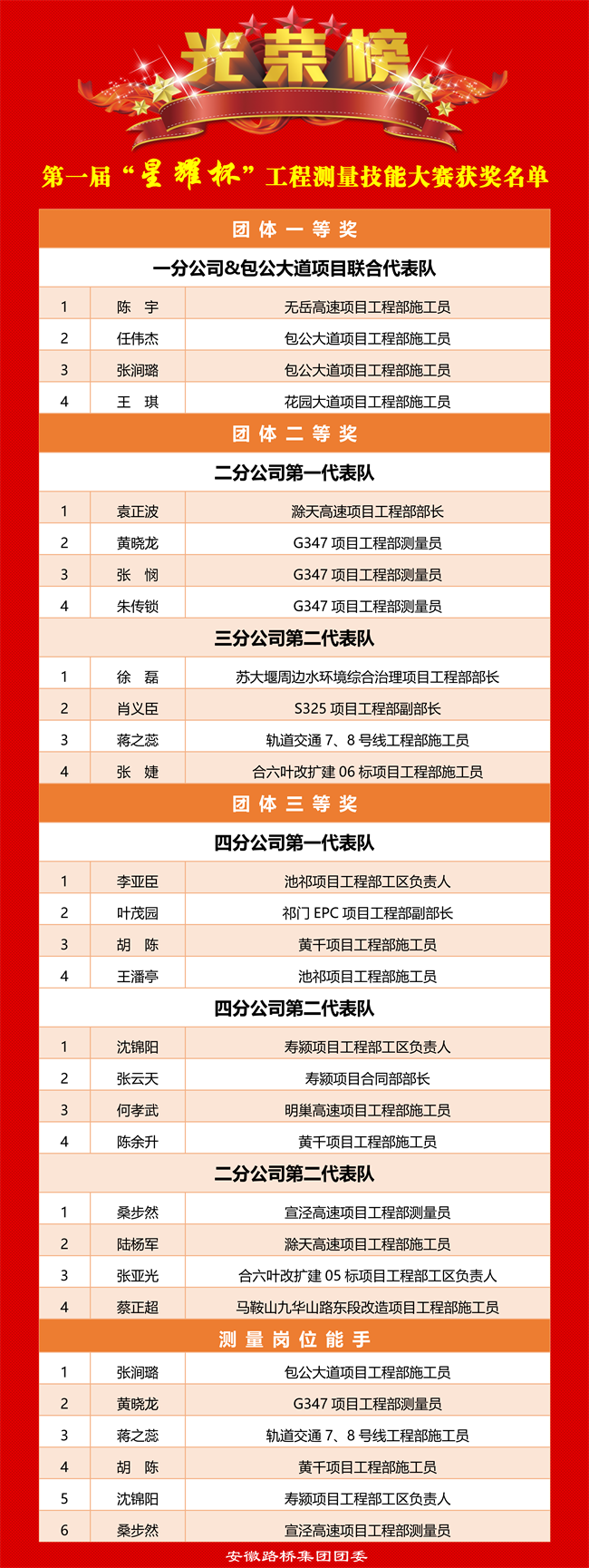 最終,經(jīng)過(guò)近5小時(shí)、5輪次的角逐,一分公司&包公大道項(xiàng)目聯(lián)合隊(duì)斬獲團(tuán)隊(duì)一等獎(jiǎng);二分公司一隊(duì)、三分公司二隊(duì)榮獲團(tuán)體二等獎(jiǎng);二分公司二隊(duì)、四分公司一隊(duì)、四分公司二隊(duì)榮獲團(tuán)體三等獎(jiǎng);張澗璐、黃曉龍、蔣之蕊、胡陳、沈錦陽(yáng)、桑步然等6人榮獲“測(cè)量崗位能手”稱(chēng)號(hào)。