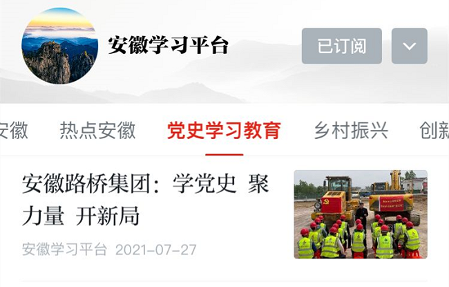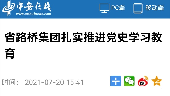 近日,“學(xué)習(xí)強(qiáng)國”安徽學(xué)習(xí)平臺和“中安在線”分別以《安徽路橋集團(tuán):學(xué)黨史 聚力量 開新局》、《省路橋集團(tuán)扎實(shí)推進(jìn)黨史學(xué)習(xí)教育》為題,對公司黨史學(xué)習(xí)教育工作開展情況進(jìn)行詳細(xì)報(bào)道。