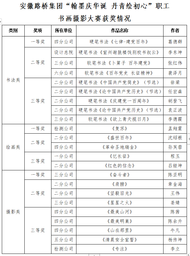 為慶祝中國共產黨成立100周年,安徽路橋集團工會舉辦“翰墨慶華誕 丹青繪初心”職工書畫攝影大賽,本次活動得到了公司領導高度重視和公司員工的積極響應,共收集各類作品64幅,其中書法作品25幅,繪畫作品11幅,攝影作品28幅。這些作品是路橋集團職工將筆墨和鏡頭對準施工生產一線,記錄下路橋人火熱的生活和勞動創造的精彩瞬間,充分展示了路橋集團廣大干部職工深厚的文化底蘊、飽滿的創作熱情和扎實的藝術功底。參賽作品風格迥異、主題突出、創意鮮明、各具特色,或意境深遠、氣勢不凡,或氣韻生動、端莊雋永,或粗獷雄逸、盡顯風神骨氣,從不同角度洋溢出作者愛祖國、愛生活的情懷,同時也展現了路橋集團人昂揚向上的時代風采。