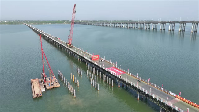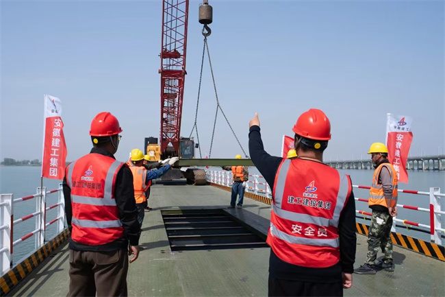 城西湖特大橋全長9117m,位于霍邱縣既有G328國道上游300m處,跨越2.5公里寬城西湖水面,整個特大橋共計75聯,引橋采用跨徑組合為30m和40m先簡支后連續預應力混凝土小箱梁,主橋采用50m+80m+50m變截面鋼箱梁。此次貫通的鋼便橋全長約2.4公里,寬6米。